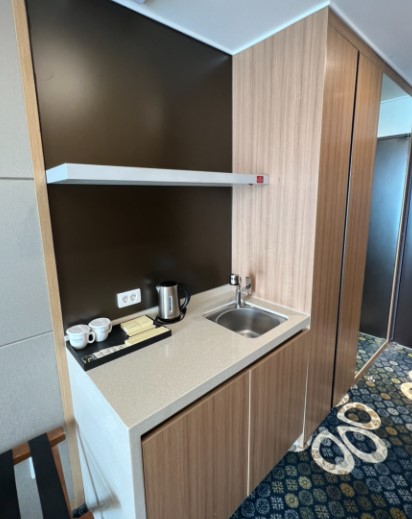 객실 한쪽에는 작은 싱크대가 설치되어 있으며, 그 위에는 간단하게 티백과 컵이 제공됩니다. 둥굴레차, 녹차, 티백 커피 등이 준비되어 있었는데, 개인적으로 티백 커피는 밤새 저를 잠에서 깨우는 원인이 되었던 것 같습니다.