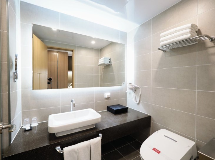 라마다 호텔에서는 샴푸, 컨디셔너, 바디워시가 대용량 용기로 벽에 고정되어 있어, 환경 보호를 위한 점이 인상적이었습니다. 다만, 칫솔과 치약은 제공되지 않으니, 필요 시 직접 준비해야 하며, 혹시 잊어버렸다면 1층 편의점에서 구입할 수 있습니다.
