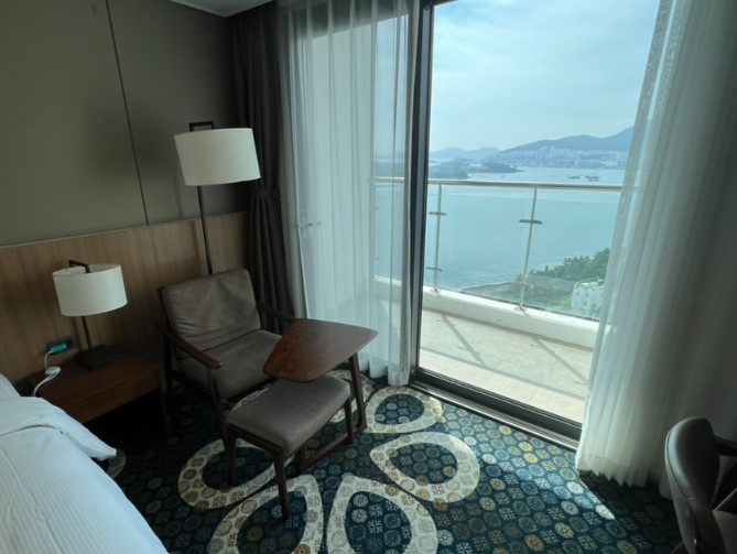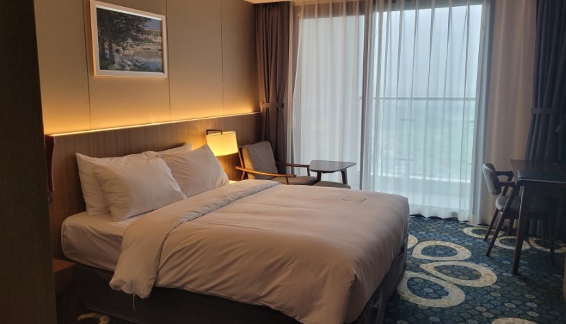 제가 묵었던 객실은 디럭스 더블 오션뷰로, 창문을 통해 바다의 일부를 감상할 수 있는 파셜 오션뷰가 특징입니다. 객실에 들어서면 첫인상이 깔끔하고 아늑하게 느껴집니다. 전체적인 객실 크기는 약 8평대로, 혼자 묵기에는 충분히 넓었고, 두 명이 머물기에도 무리 없이 편안하게 사용할 수 있는 공간이었습니다.
