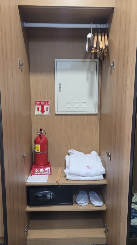 객실 문을 열고 들어서면 작은 복도를 지나 메인 공간으로 연결됩니다. 복도 왼쪽에는 옷장과 금고가 마련되어 있고, 오른쪽에는 욕실이 위치해 있습니다.