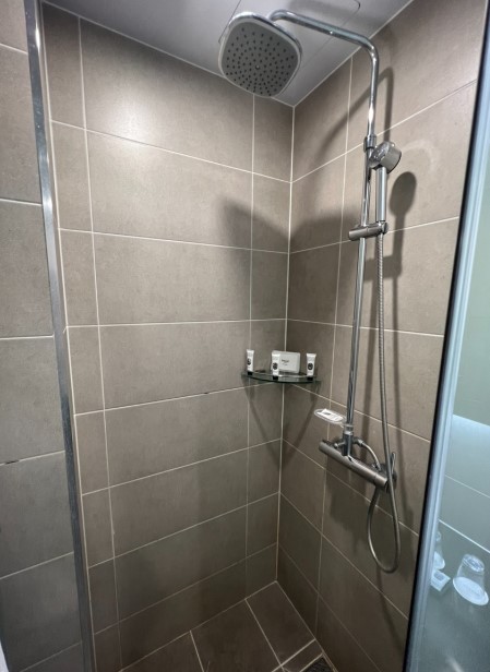 욕실에는 넉넉한 크기의 세면대와 샤워 부스가 설치되어 있습니다. 샤워 부스는 조금 협소하긴 했지만, 전체적으로는 깔끔하게 관리되어 있었습니다.