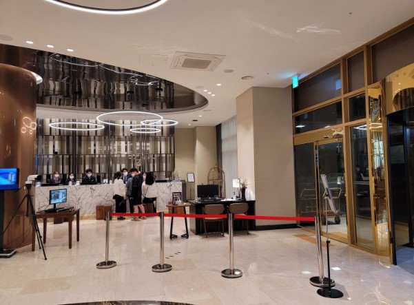 객실 내에는 기본적으로 냉장고와 함께 무료 생수 2병이 제공됩니다. 침대 양옆의 협탁에는 각종 충전기가 설치되어 있어 휴대폰이나 다른 기기들을 쉽게 충전할 수 있습니다.