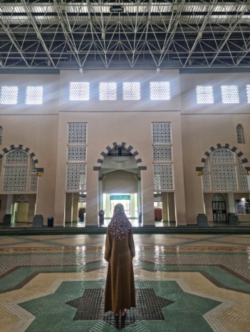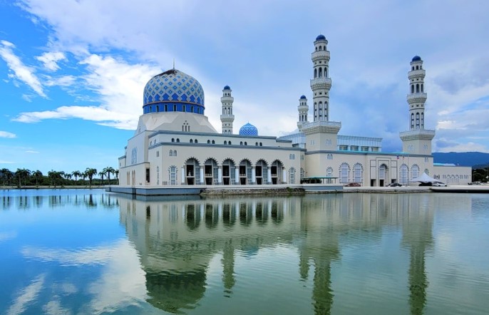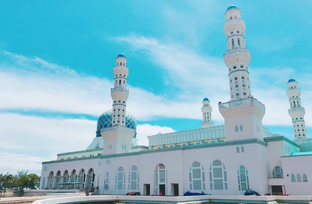 핑크 모스크를 둘러본 후에는 코타키나발루 시티 모스크, 일명 ‘블루 모스크’로 이동했습니다. 이곳은 코타키나발루에서 가장 큰 현대식 이슬람 사원으로, 푸른 빛을 띠는 외관 덕분에 '블루 모스크'라는 이름으로 불리고 있습니다. 이곳에서 아주 특별한 체험을 할 수 있는데요, 바로 말레이 전통 의상을 입고 히잡을 착용해 보는 경험입니다.