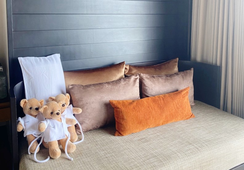 객실에 들어서자마자 반기는 것은 저희 이름이 새겨진 귀여운 곰 인형이었습니다. 리조트에서는 고객의 이름을 기재한 인형과 함께 맞이해 주는 세심한 서비스를 제공하고 있어, 처음부터 기분이 좋아지는 경험을 할 수 있었습니다.