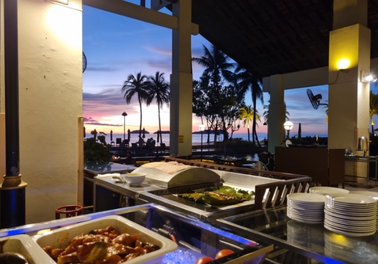 코타키나발루 여행에서 빼놓을 수 없는 것이 바로 석양입니다. 저녁에는 석양을 바라보며 현지 뷔페 식사를 즐길 수 있는 레스토랑을 예약했습니다.