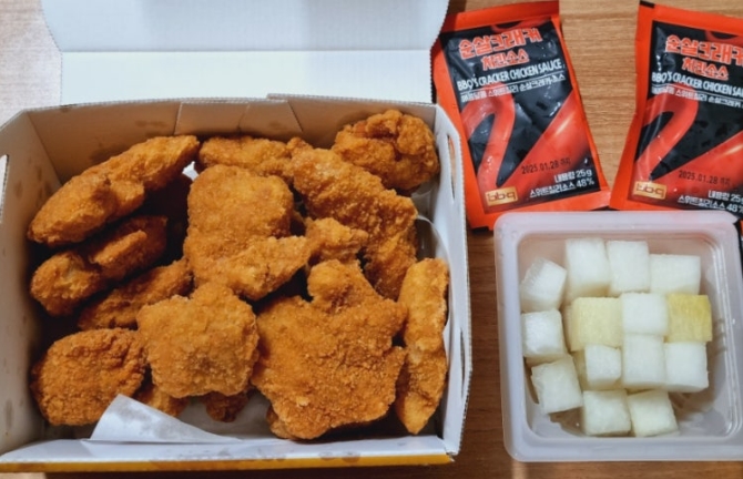 BBQ의 크런치 순살크래커는 튀김옷이 두껍고 바삭한 식감을 극대화한 치킨입니다. 치킨을 한 입 베어 물면 정말 ‘크런치’한 소리가 날 정도로 바삭함이 강조되어 있어요.
