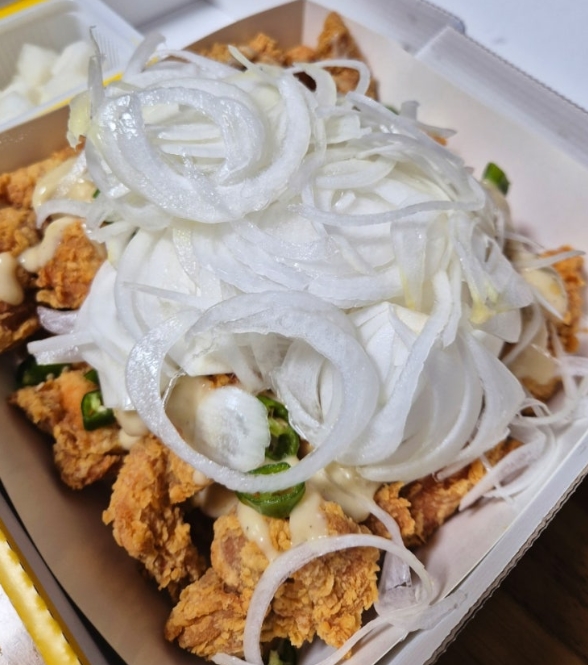 바삭하게 튀겨진 순살 치킨 위에 부드러운 마요네즈 소스가 듬뿍 뿌려져 있어, 첫맛은 달콤하고 고소하지만, 점차 청양고추 특유의 매운맛이 올라와 입맛을 자극합니다.