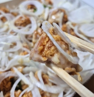 한 입을 먹었을 때, 상큼하고 새콤달콤한 오리엔탈 소스가 치킨과 잘 어우러지며, 신선한 파의 향이 입안에서 은은하게 퍼집니다.