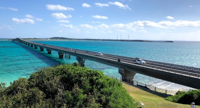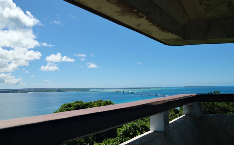 끝없이 펼쳐진 에메랄드빛 바다와 그 위를 가로지르는 이라부 대교의 모습이 한눈에 들어왔어요. 바람이 살랑살랑 불어와 기분 좋은 청량감을 더해주었습니다.