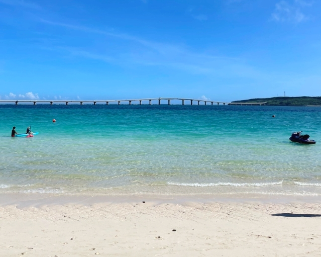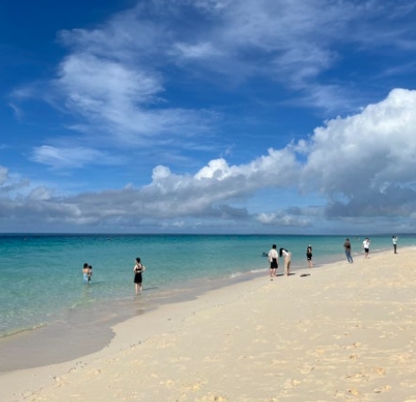 전망대를 방문한 후에는 미야코지마에서 가장 유명한 해변인 요나하 마에하마 비치로 이동했습니다. 차를 타고 10분 정도 이동하면 도착할 수 있었어요. 이곳은 일본에서도 손꼽히는 아름다운 해변으로, 새하얀 모래사장과 맑고 푸른 바다가 조화를 이루고 있었습니다.