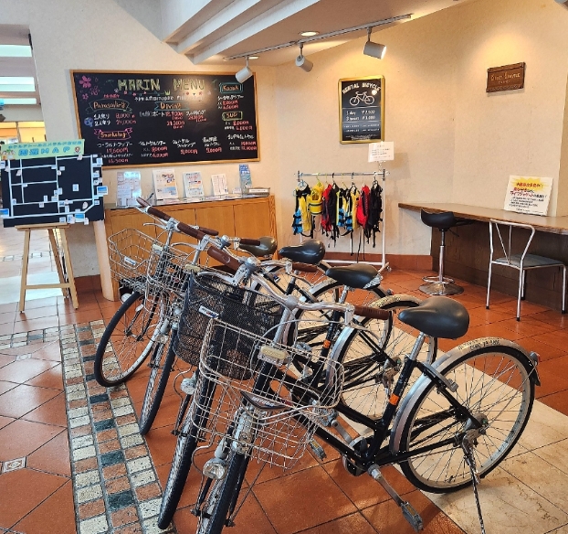 호텔에는 자전거 대여 서비스도 제공되고 있어, 우리는 전기 자전거를 대여해 호텔 주변을 둘러보았습니다. 3시간 기준 1,000엔이라는 가격으로 저렴하게 이용할 수 있었으며, 자전거를 타고 미야코지마의 아름다운 풍경을 천천히 감상할 수 있어 색다른 경험이었습니다.