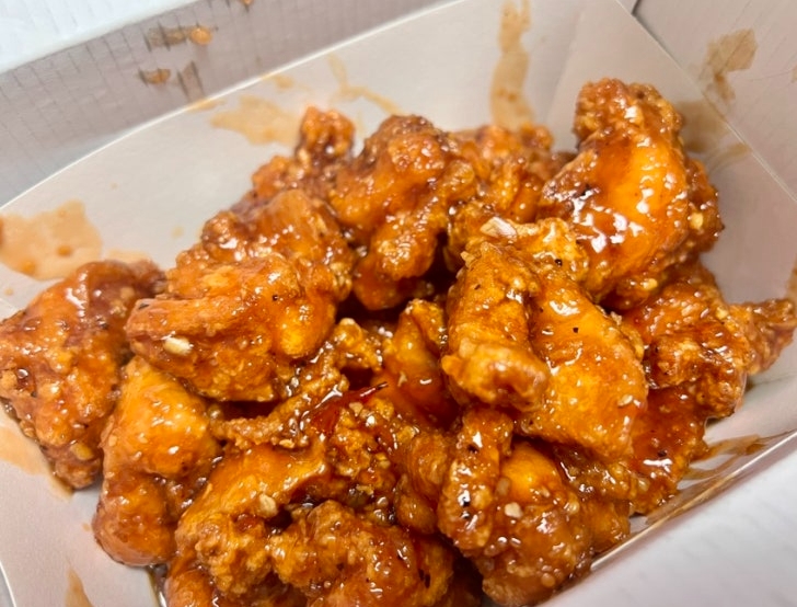 60계치킨의 꿀간장누룽지싸이순살은 기대 이상으로 만족스러웠던 메뉴였어요. 일단 포장을 열자마자 꿀간장 소스의 윤기 있는 비주얼과 함께 매콤한 고추 조각들이 눈에 띄더라고요.