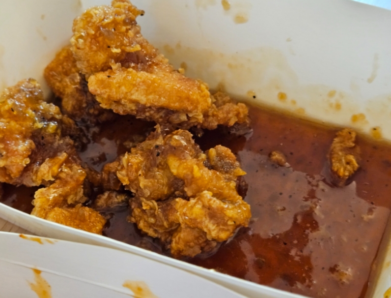 살살 저어가며 먹다 보니 치킨 전체에 골고루 스며들고, 짜지 않고 고소하면서 살짝 매콤한 맛이 입맛을 제대로 자극했어요. 소스 자체가 묘하게 라유 느낌도 나고, 딱히 맵진 않은데 뒷맛이 살짝 얼얼한 게 매력적이었어요.