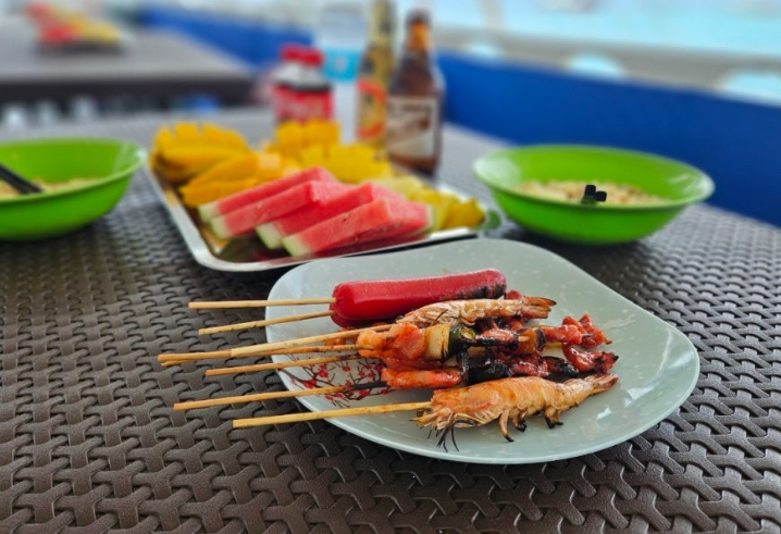 생선요리, 바비큐, 채소, 밥 등 필리핀의 맛을 제대로 느낄 수 있는 구성으로, 바다 위에서의 식사는 그 자체로 특별했습니다.