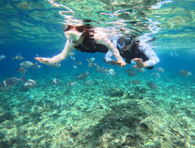 마스크, 스노클, 구명조끼까지 모두 살균 소독을 마친 장비로 준비되어 있었고, 착용도 도와주셨습니다. 바다에 들어서자마자 시원한 물결이 온몸을 감싸고, 물속 아래에는 형형색색의 물고기들이 자유롭게 헤엄치고 있었습니다.