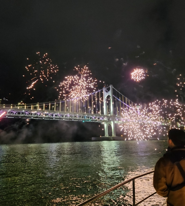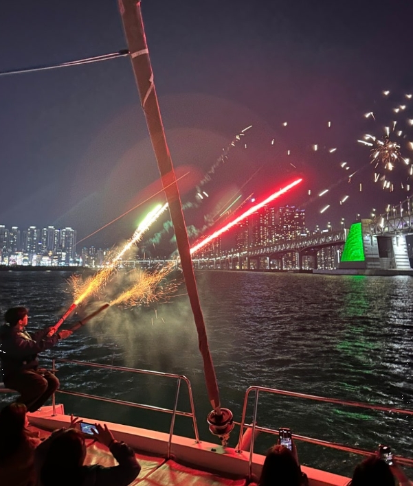 크진 않지만 요트 갑판 앞에서 반짝이는 불꽃이 터질 때, 아이들은 물론 어른들도 "우와!" 소리를 지를 정도로 분위기가 한껏 무르익었어요. 이때 들려오는 음악과 함께, 짧지만 깊은 감동을 느낄 수 있었죠.