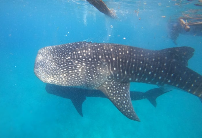 구명조끼와 스노클을 착용하고 바다에 들어간 순간, 바로 눈앞에서 거대한 고래상어가 유유히 헤엄치고 있었어요.
