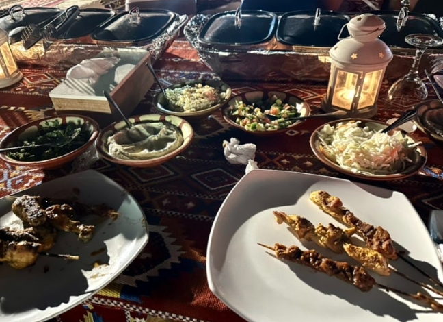 저녁이 되자 뷔페식 바비큐 디너가 시작됐어요. 양고기, 닭고기, 샐러드, 후무스 등 현지 스타일의 음식들이 다양하게 준비되어 있었고, 저는 양고기 꼬치를 정말 맛있게 먹었어요. 사막에서 별빛을 바라보며 먹는 저녁 식사는 정말 낭만적이었어요.
