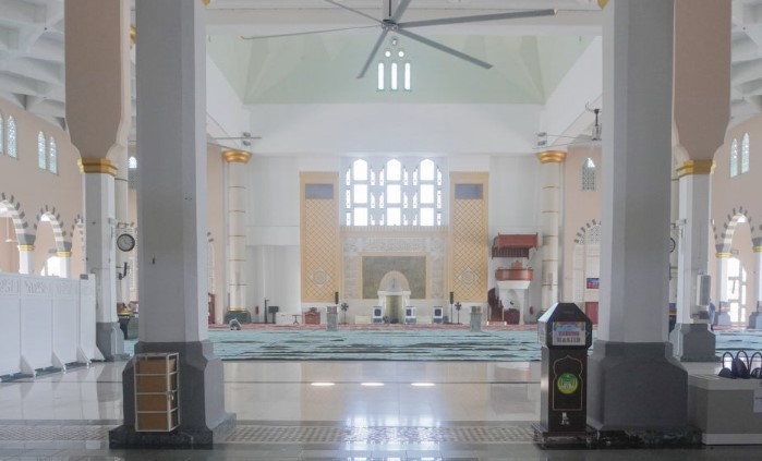 핑크 모스크를 둘러본 후에는 코타키나발루 시티 모스크, 일명 ‘블루 모스크’로 이동했습니다. 이곳은 코타키나발루에서 가장 큰 현대식 이슬람 사원으로, 푸른 빛을 띠는 외관 덕분에 '블루 모스크'라는 이름으로 불리고 있습니다. 이곳에서 아주 특별한 체험을 할 수 있는데요, 바로 말레이 전통 의상을 입고 히잡을 착용해 보는 경험입니다.
